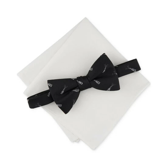 Lean into the joy and celebration at your next black-tie event with this bow tie and pocket-square set from Bar III, adorned with subtle champagne bottles to help you pop some corks.
