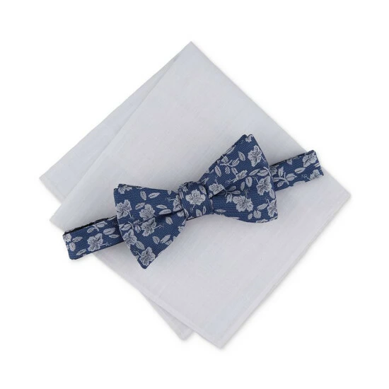 A distinctive finish for your formal look, this set from Bar III pairs a solid, understated pocket square with a coordinating floral bow tie.