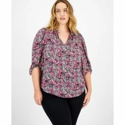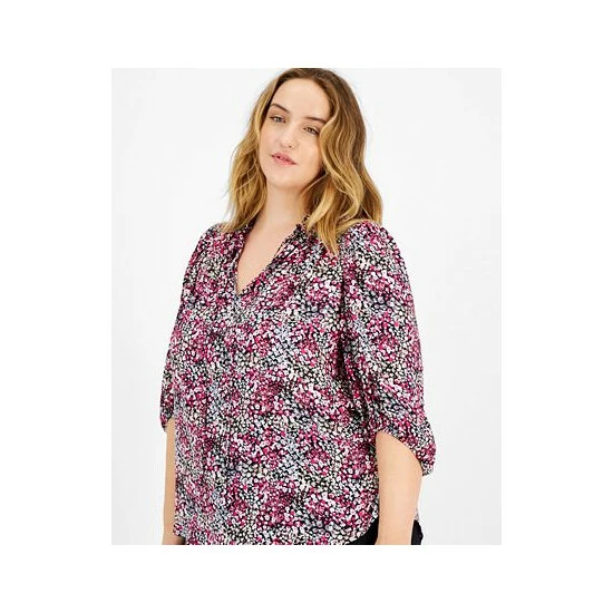 Designed in an all-over ditsy floral print and a split neckline, this Bar III top offers coverage at no cost to style.