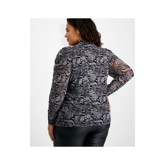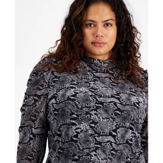 Soft draping puffs out the sleeves while animal print levels up the style of this business-friendly plus size turtleneck top from Bar III.