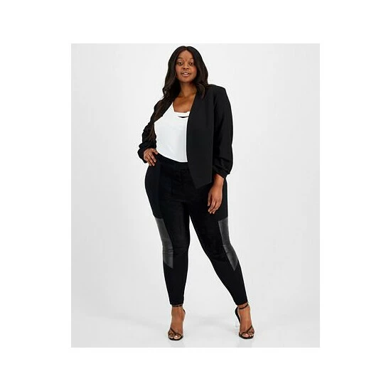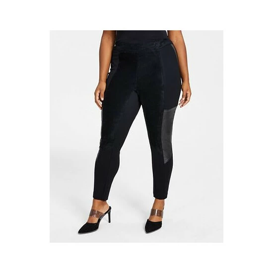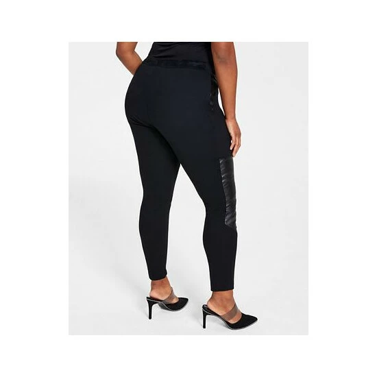 An edgy patchwork of faux-leather and faux-suede revs up the moto-inspired look of these ultra-cool plus size ponté-knit leggings from Bar III.