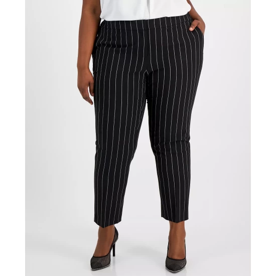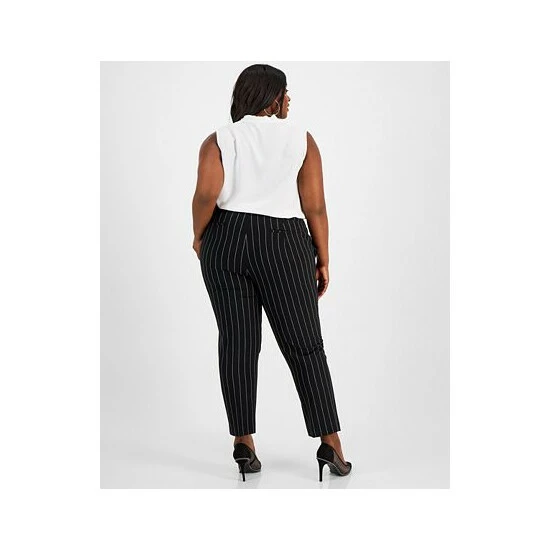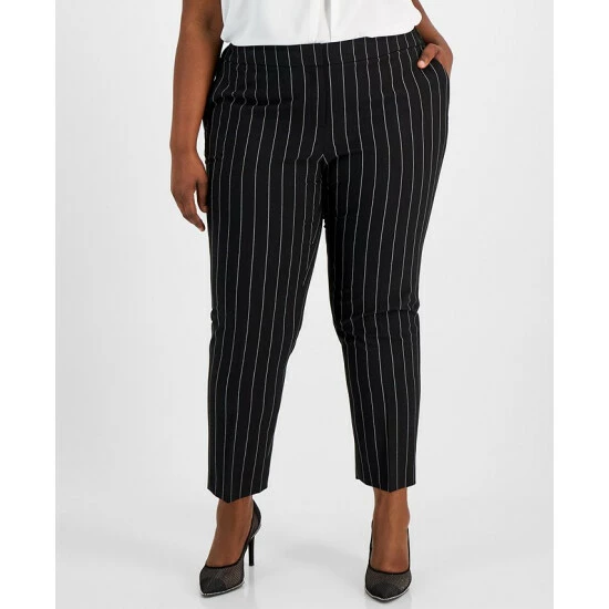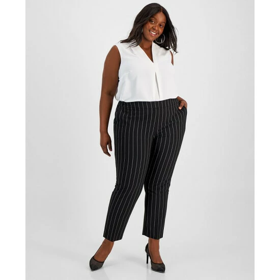 Look sleek and polished in Bar III’s plus size straight ankle pants, featuring classic pinstripes with a stretch fabric.