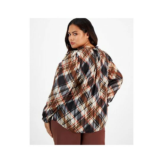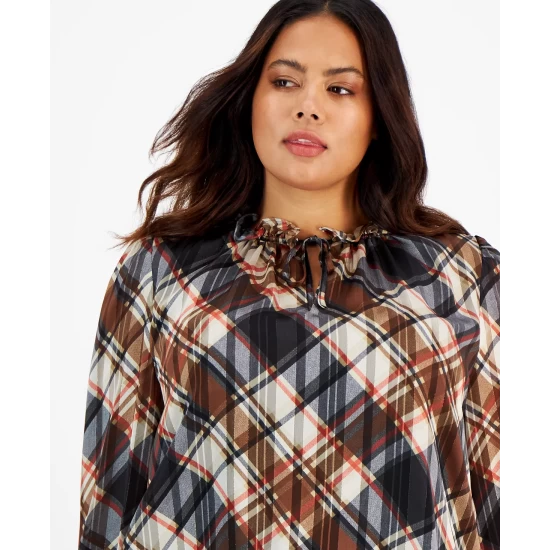 A sophisticated take on the plaid shirt. Bar III makes this one office-appropriate with ruffles and a chic tie-neck.
