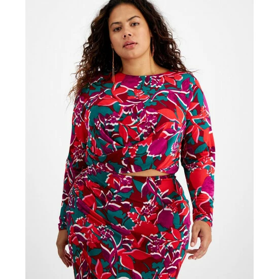Standout color defines this plus-size printed top from Bar III, cropped to perfection and perfect for pairing with high rise bottoms.