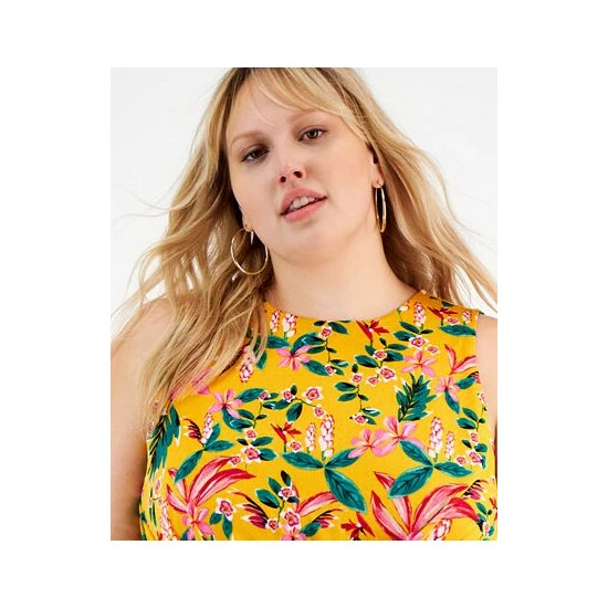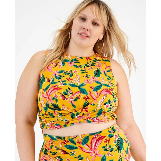 Bar III’s plus size floral-print top gets breezy with a sleeveless, cropped and crossover-hem silhouette.