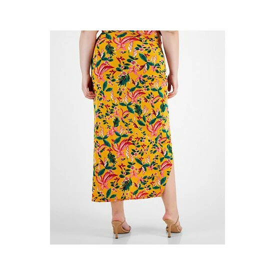 A floral-print stretch fabric and a wrap-like silhouette adds a trend-forward touch to Bar III’s plus size midi skirt.