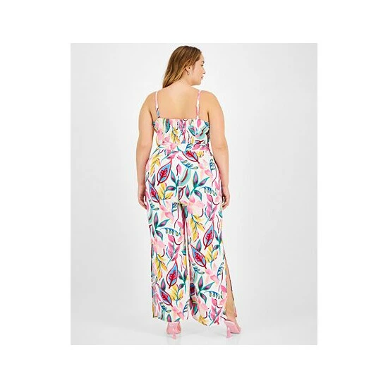 Channel chic vibes in this printed plus size jumpsuit from Bar III, featured in dynamic prints and finished with flirty slits at the hem.