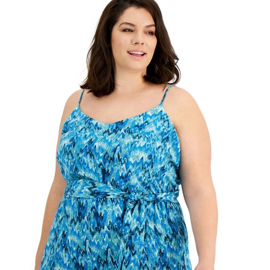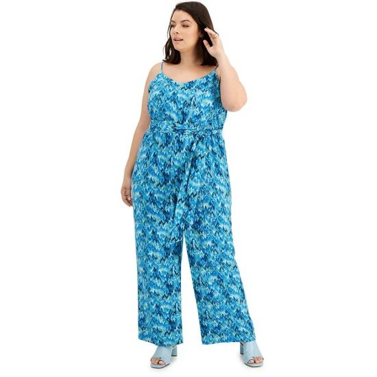 Land a fresh and flattering look with Bar III’s plus size wide-leg jumpsuit, showcasing a bold print.