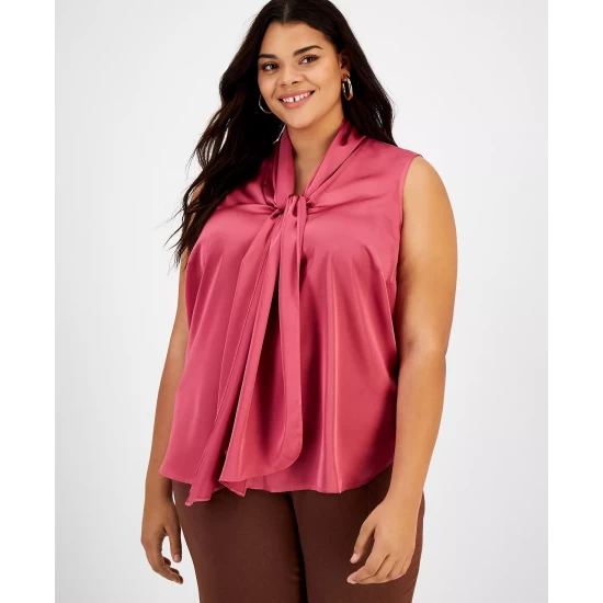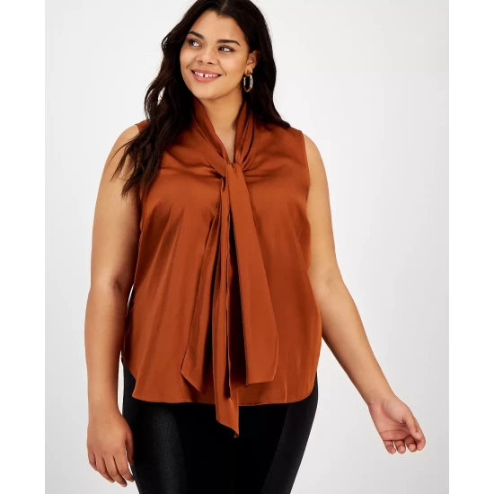Be boardroom-ready in this plus size sleeveless blouse by Bar III that is elevated with bow-tie detail, lending a polished edge to a versatile look.