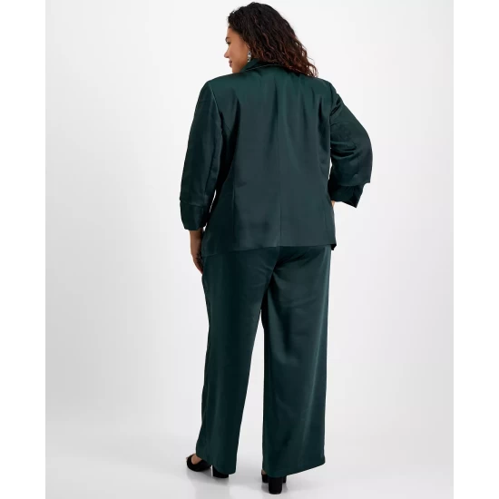 Washed satin dresses up the laid-back details (like pleated sleeves and a drawstring waist) of Bar III’s plus size jacket and pull-on pants to add professional polish to your look.