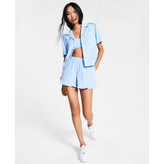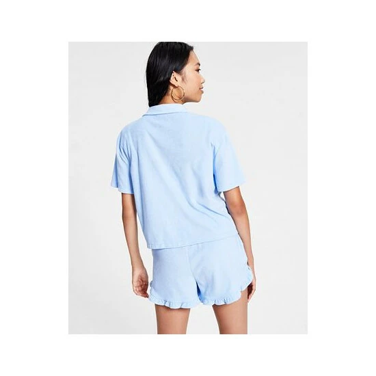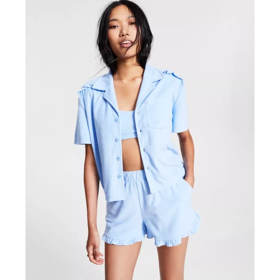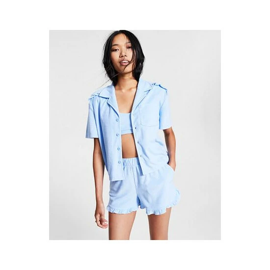 Get cozy in this terry cloth camp shirt from Bar III designed with subtle ruffled trim and a single patch pocket.