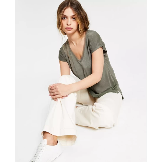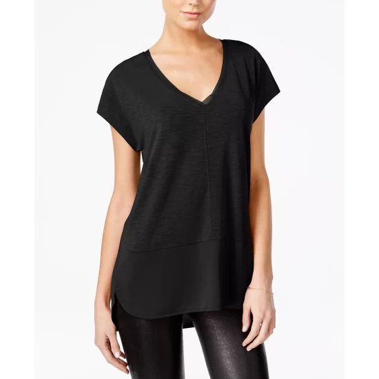 A smooth contrast hem lends airy style to this chic, lightweight top from Bar III.