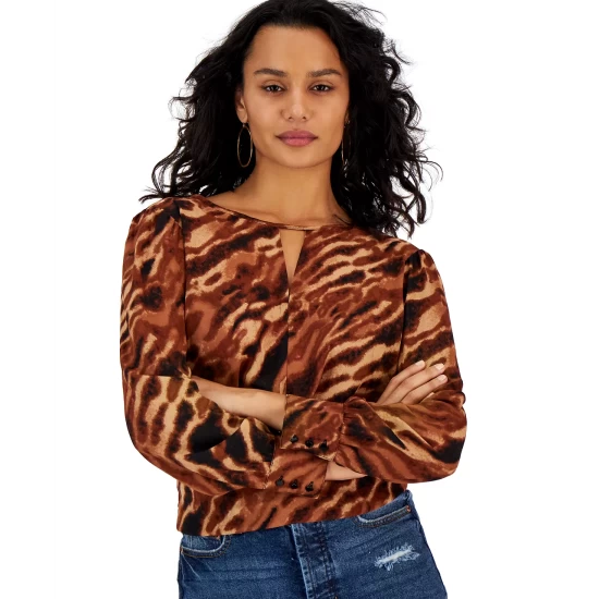 Go wild in Bar III’s cropped blouse, styled with an animal print and a discreet keyhole at the neckline.