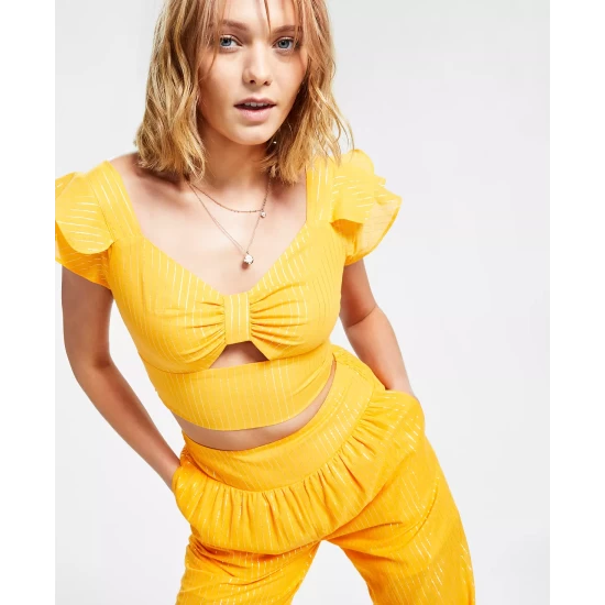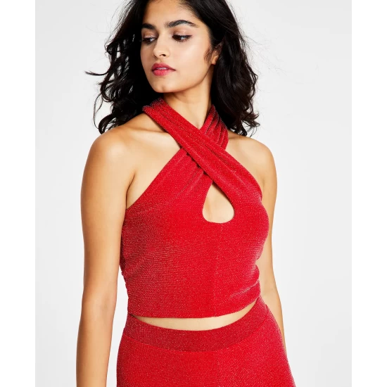 Allover glittering details draw the eye in this chic halter-style tank top from Bar III.