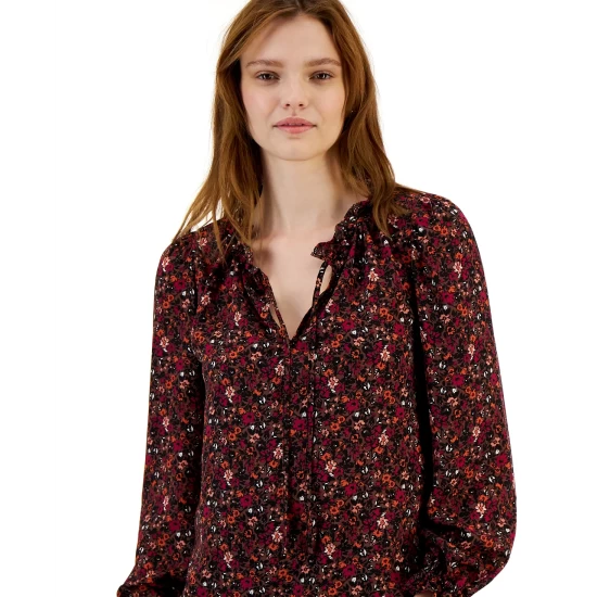 A peasant top from Bar III gets a lift from ruffle trim and a retro-inspired floral print.