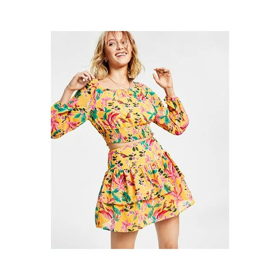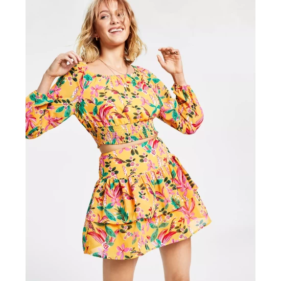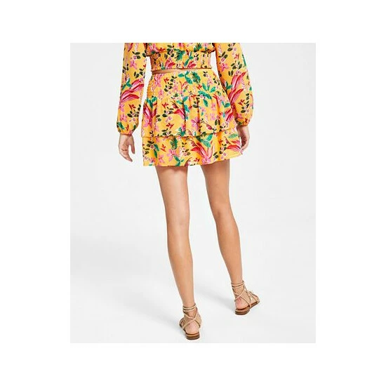 Cheerful florals and a tiered, ruffled hem team up to make magic in this sweet mini skirt from Bar III.