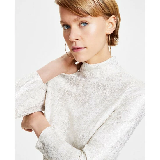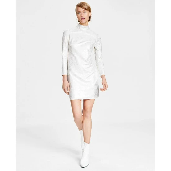 Bar III works wonders in your wardrobe with this metallic knit sheath dress designed with a mock turtleneck and long sleeves.