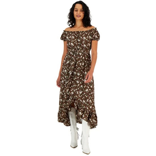 Soon to be the cutest thing in your closet, this Bar III dress is flirty and femme with its off-the-shoulder neckline and puffed sleeves.