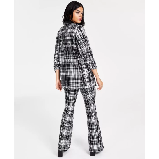 Look like a total boss in Bar III’s polished professional pieces, a plaid blazer and plaid flare pants paired with a coordinating plaid square-neck top.