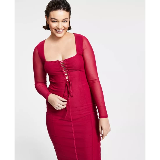 A super-chic lace-up detail adds edge to the front of this fitted long-sleeved midi dress from Bar III.