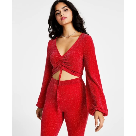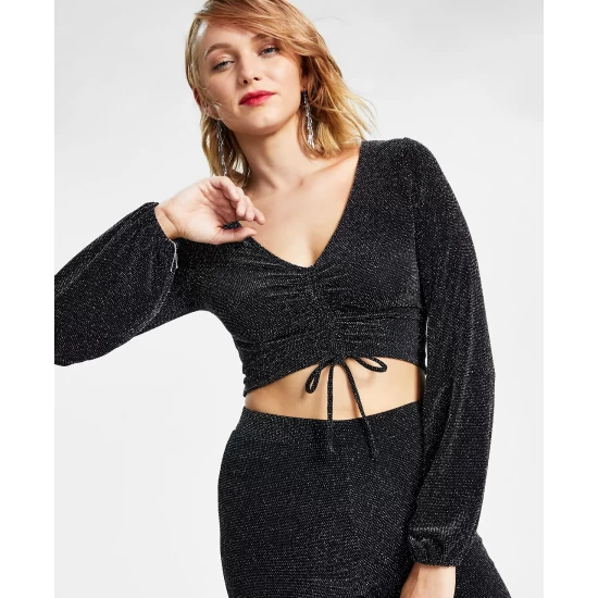 Bar III’s crop top has it all: billowing balloon sleeves, a drawstring-ruched hem and allover glitter details.