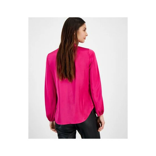 Subtle detail defines this Bar III blouse; the cinched sleeves create a clean sleek look while the tie at the neckline finishes with polish.