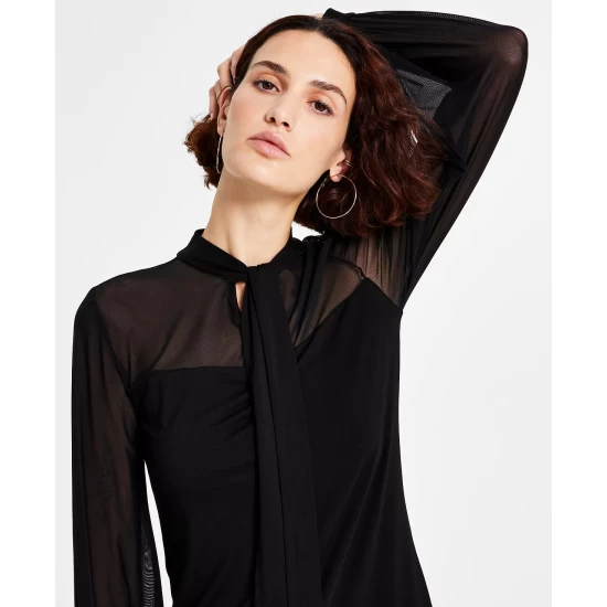 Outlet 🤩 Bar III 👩 Women’s Mesh Mock-Neck Sheer-Sleeve Tie-Back Top, Created For Macy’s Deep Black ✨