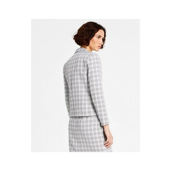 - Textured plaid tweed fabric; shoulder pads