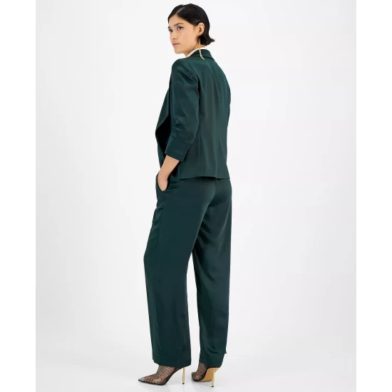 Washed satin dresses up the laid-back details (like pleated sleeves and a drawstring waist) of Bar III’s jacket and pull-on pants to add professional polish to your look.