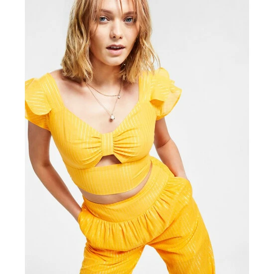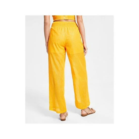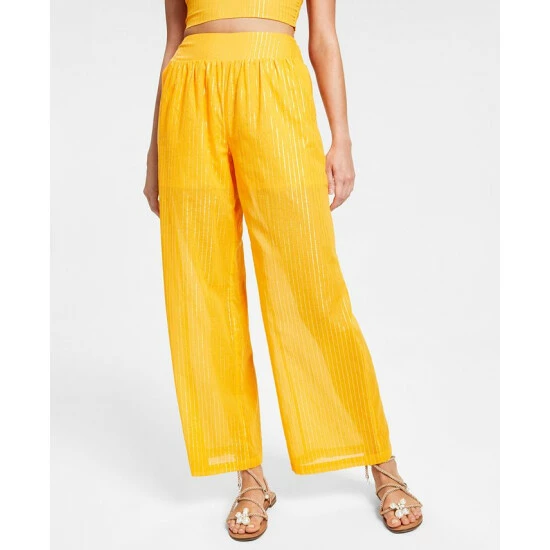 Allover shimmering metallic stripes brighten these sweet wide-leg pull-on pants from Bar III.